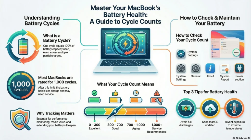 Apple designs MacBook batteries to endure roughly 1,000 cycles for most models. Once this threshold is approached, the battery’s full charge capacity starts to decline gradually. Understanding battery cycles helps prevent unexpected shutdowns and gives you insight into your device’s long-term health.